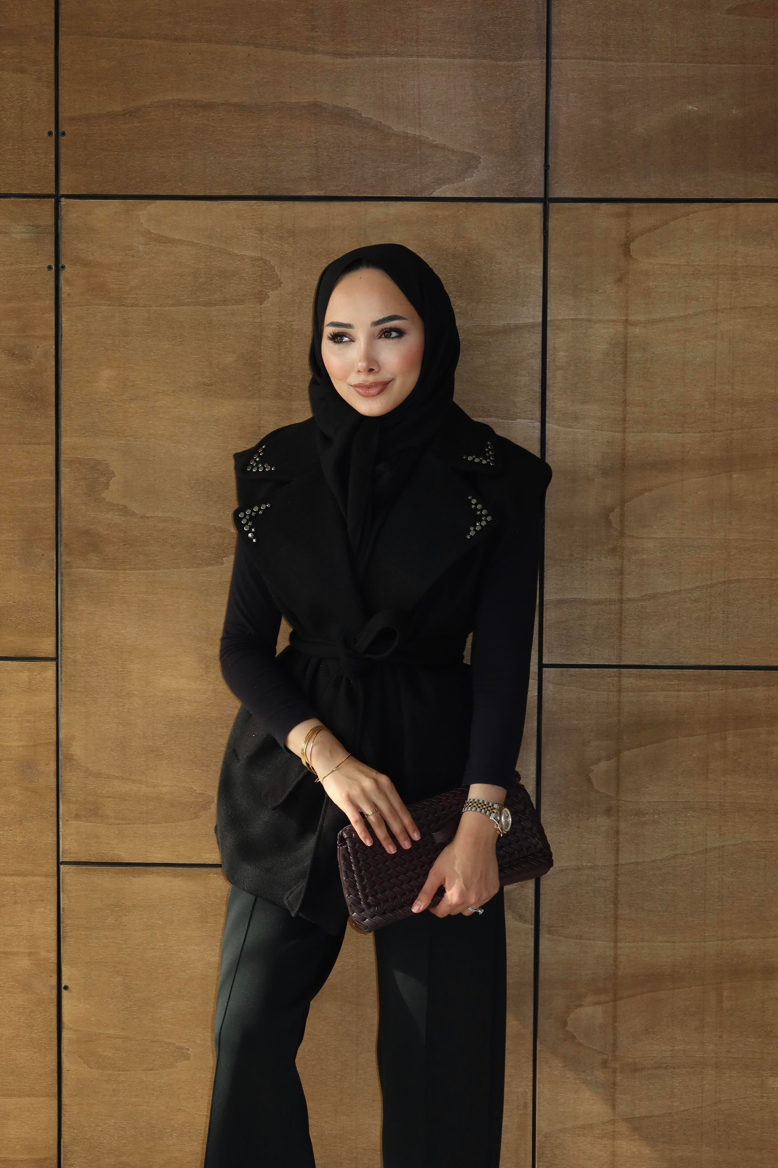 Kaşe kumaş, yaka ucu zımba detaylı, seyyar kuşaklı, çift cepli, yelek içi astarlıdır