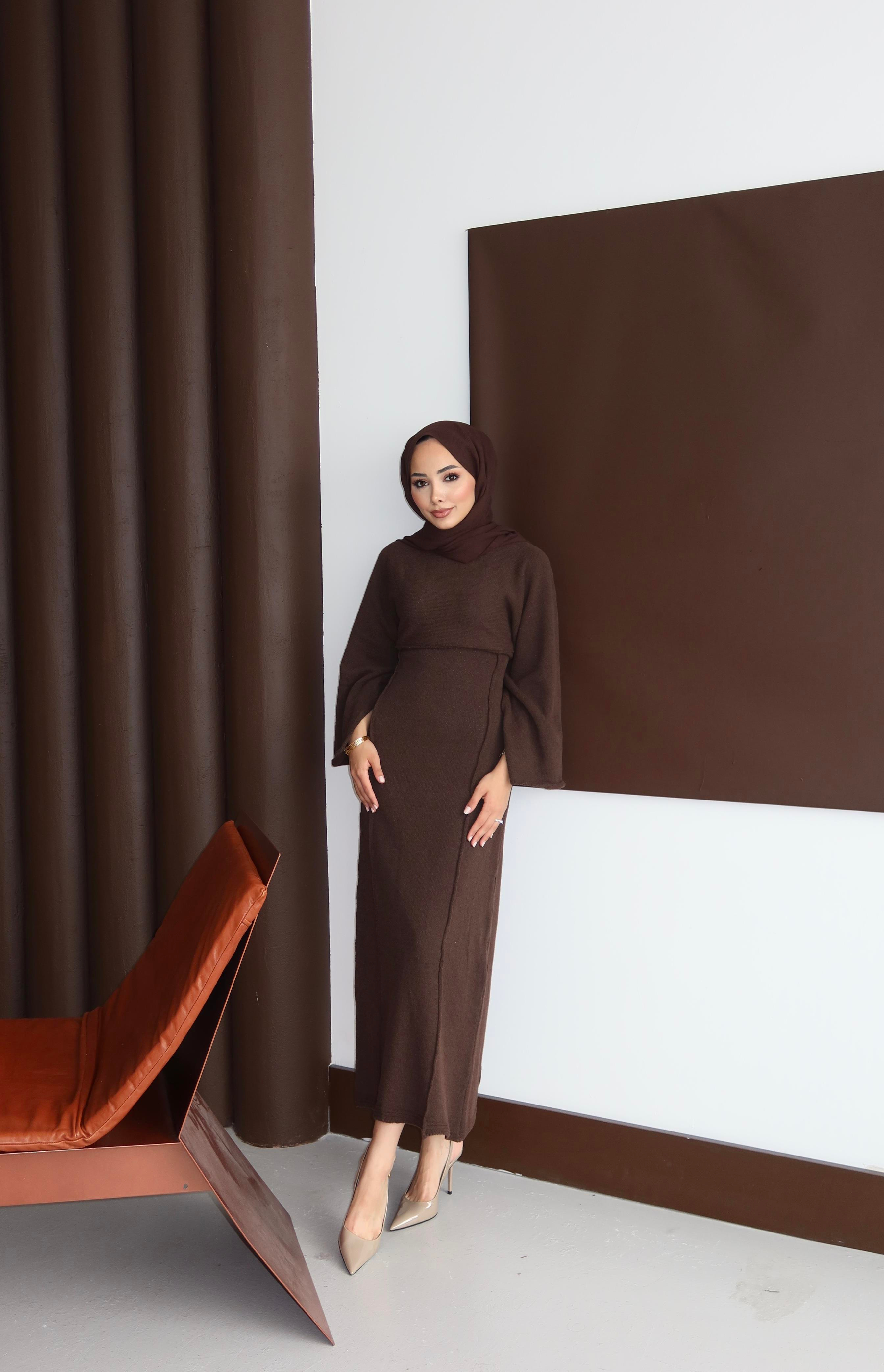 VELİNA YIRTMAÇLI TRİKO ELBİSE KAHVE